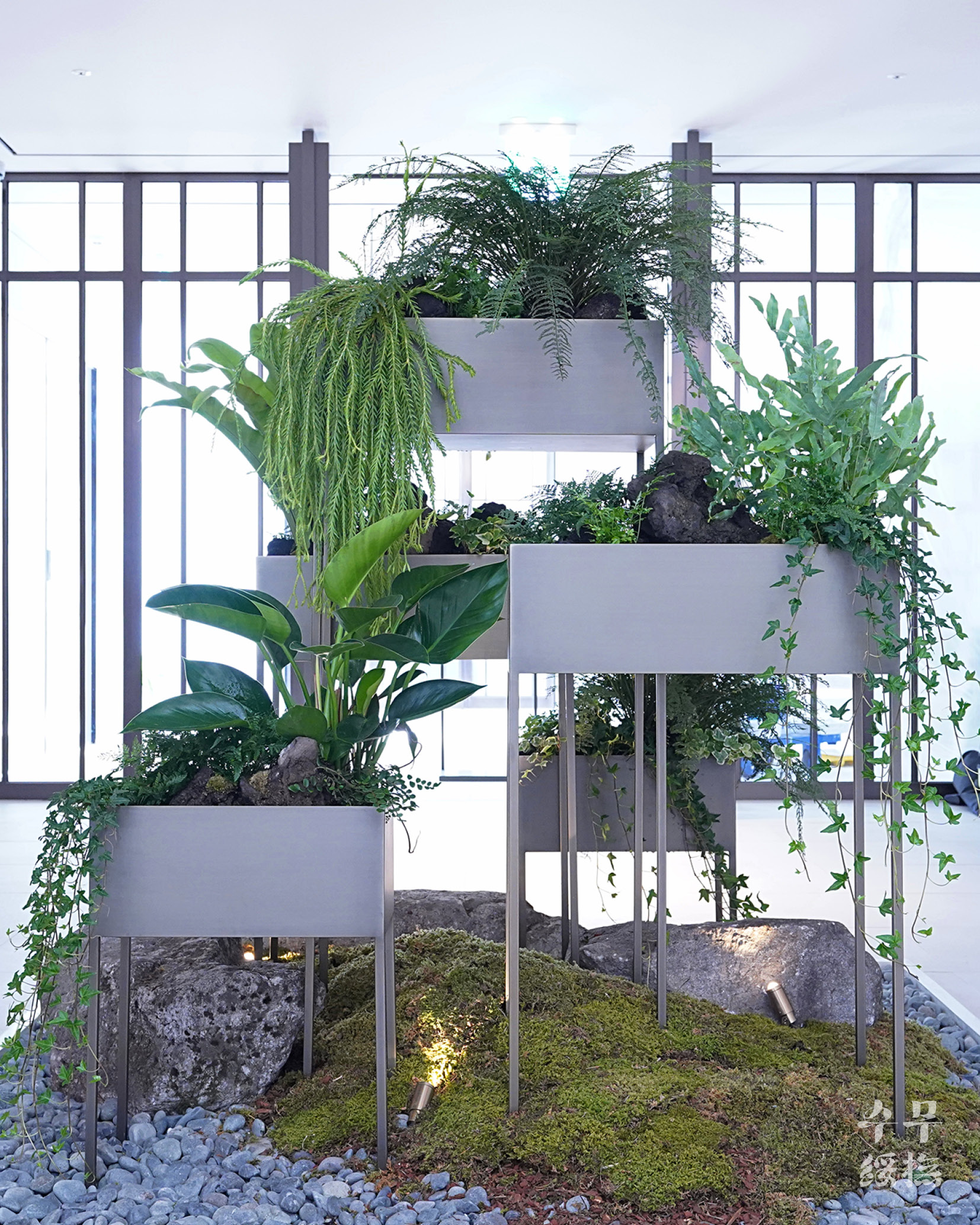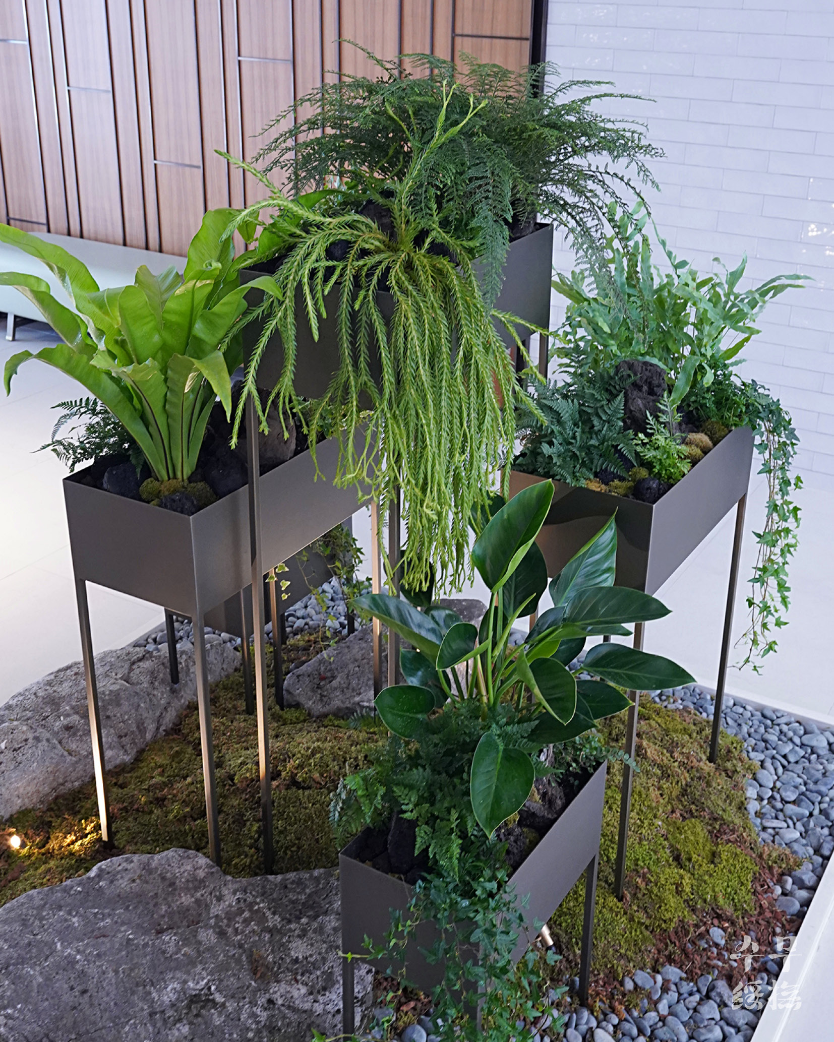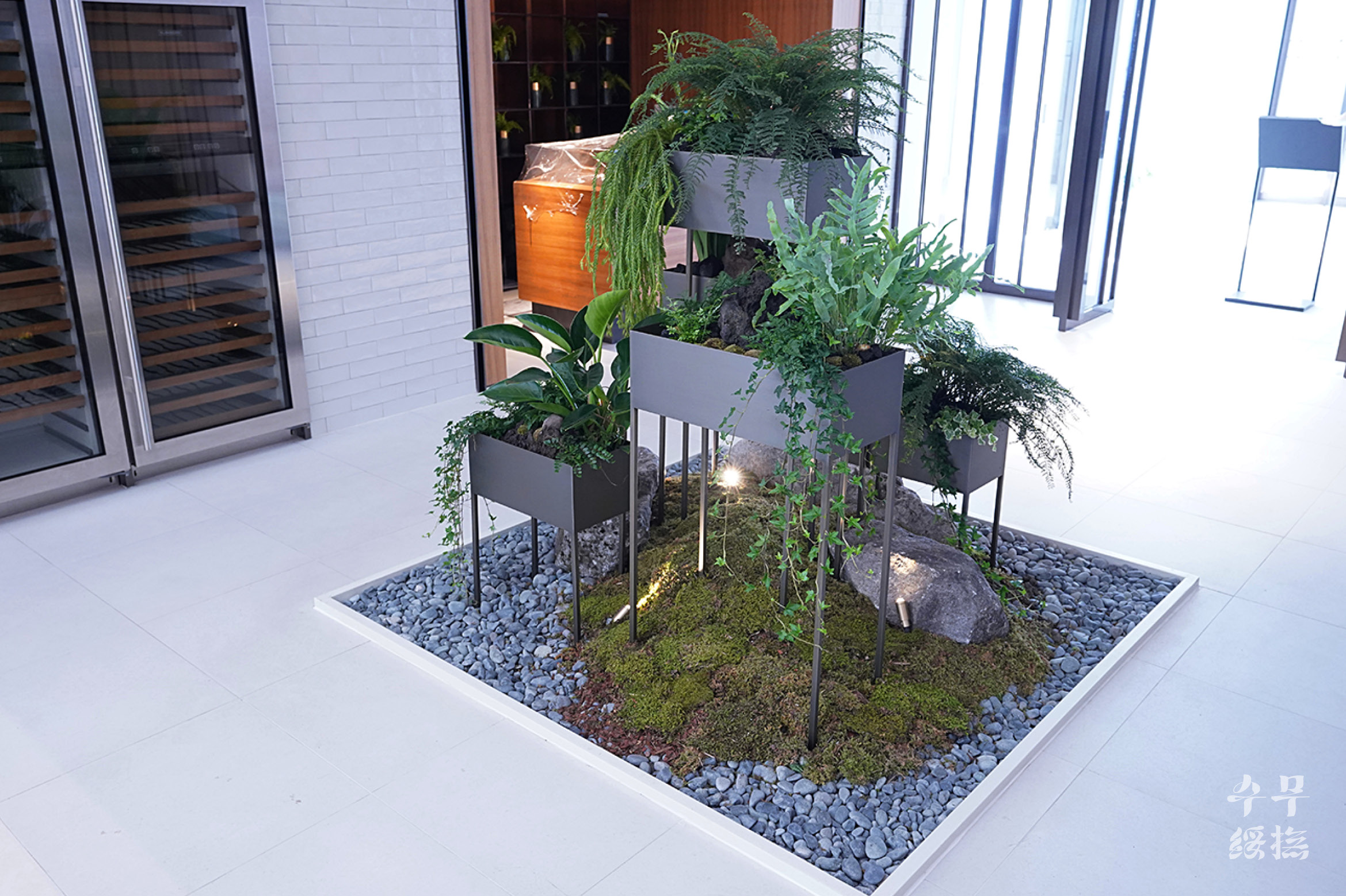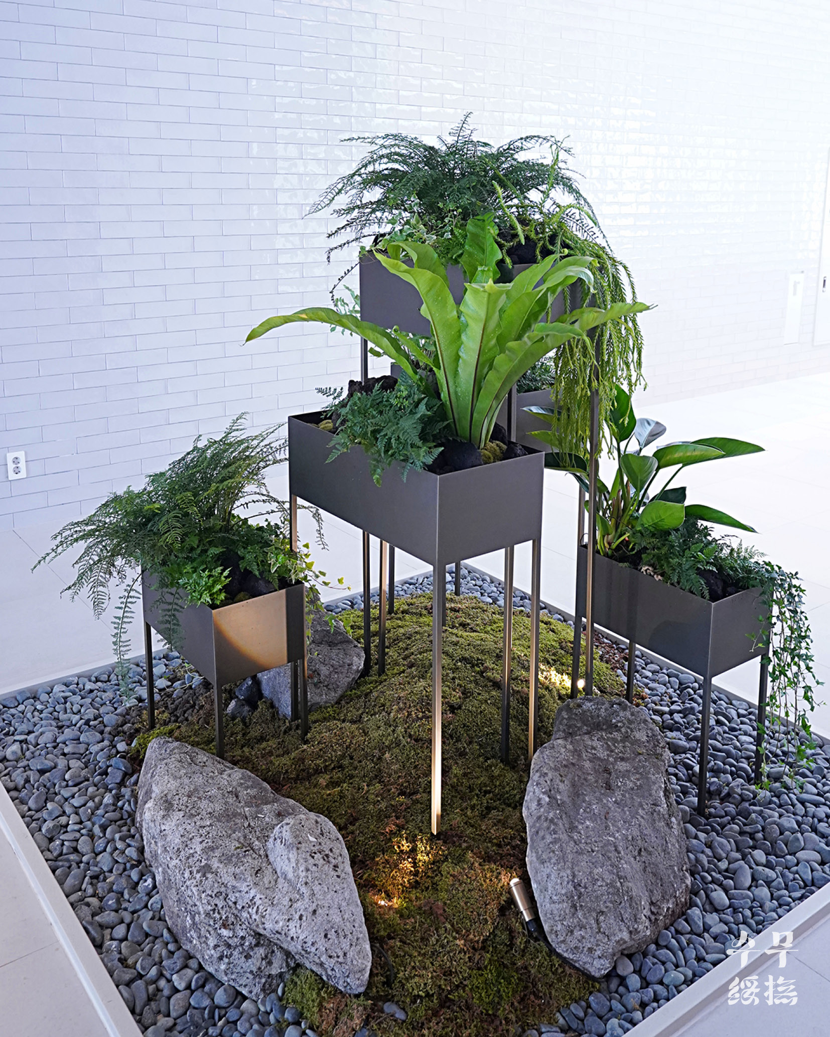 작업을 할 위치는 입구 바로 앞의 공간이었다. 이미 있었던 조화 나무는 제거된 상태였고, 하단부에 돌과 이끼, 조화로 된 고사리만이 남아있었다. 하단부는 조화로 된 고사리만 제거하고 유지하고자 했기 때문에 그 위로 플랜트 박스를 설치했다.