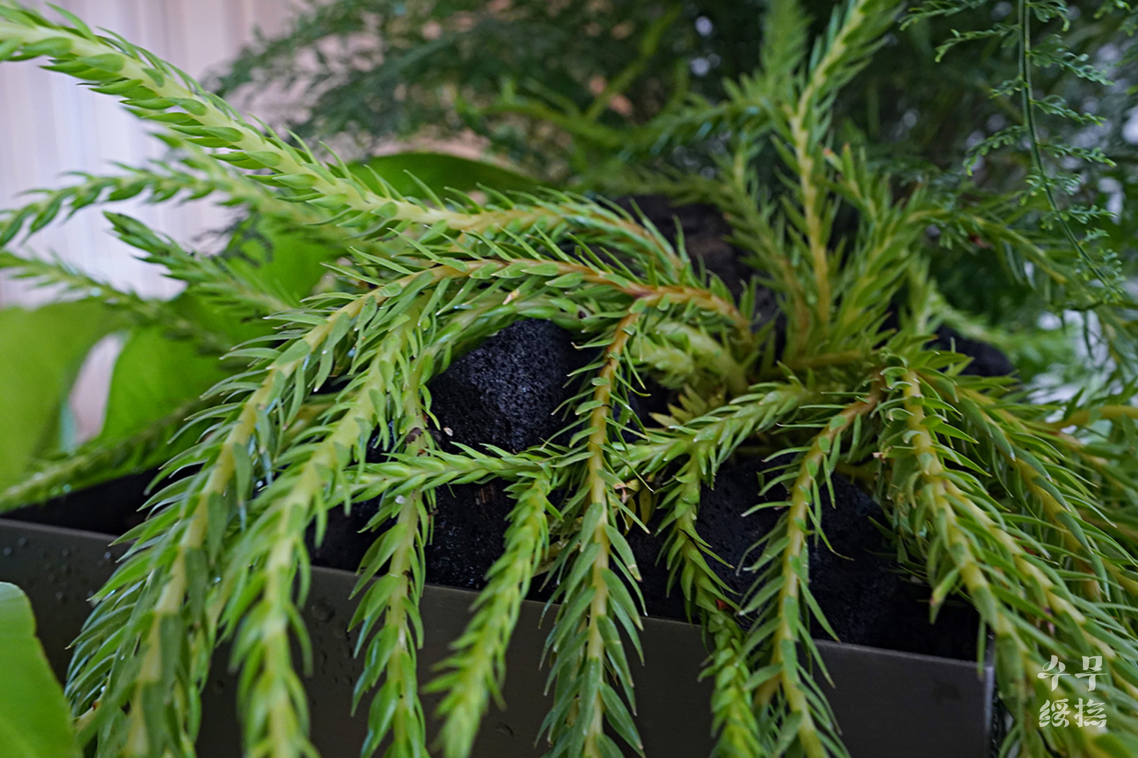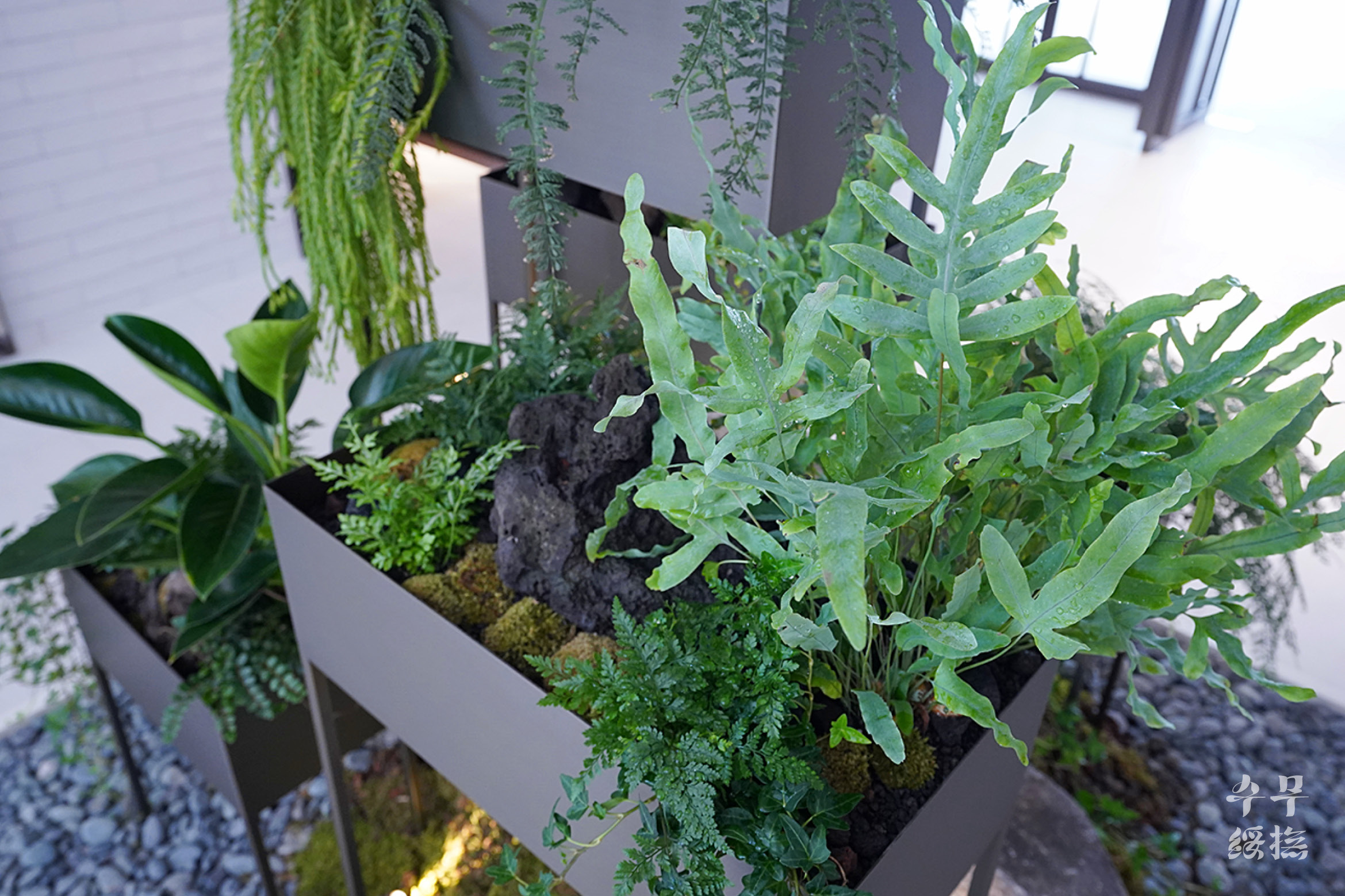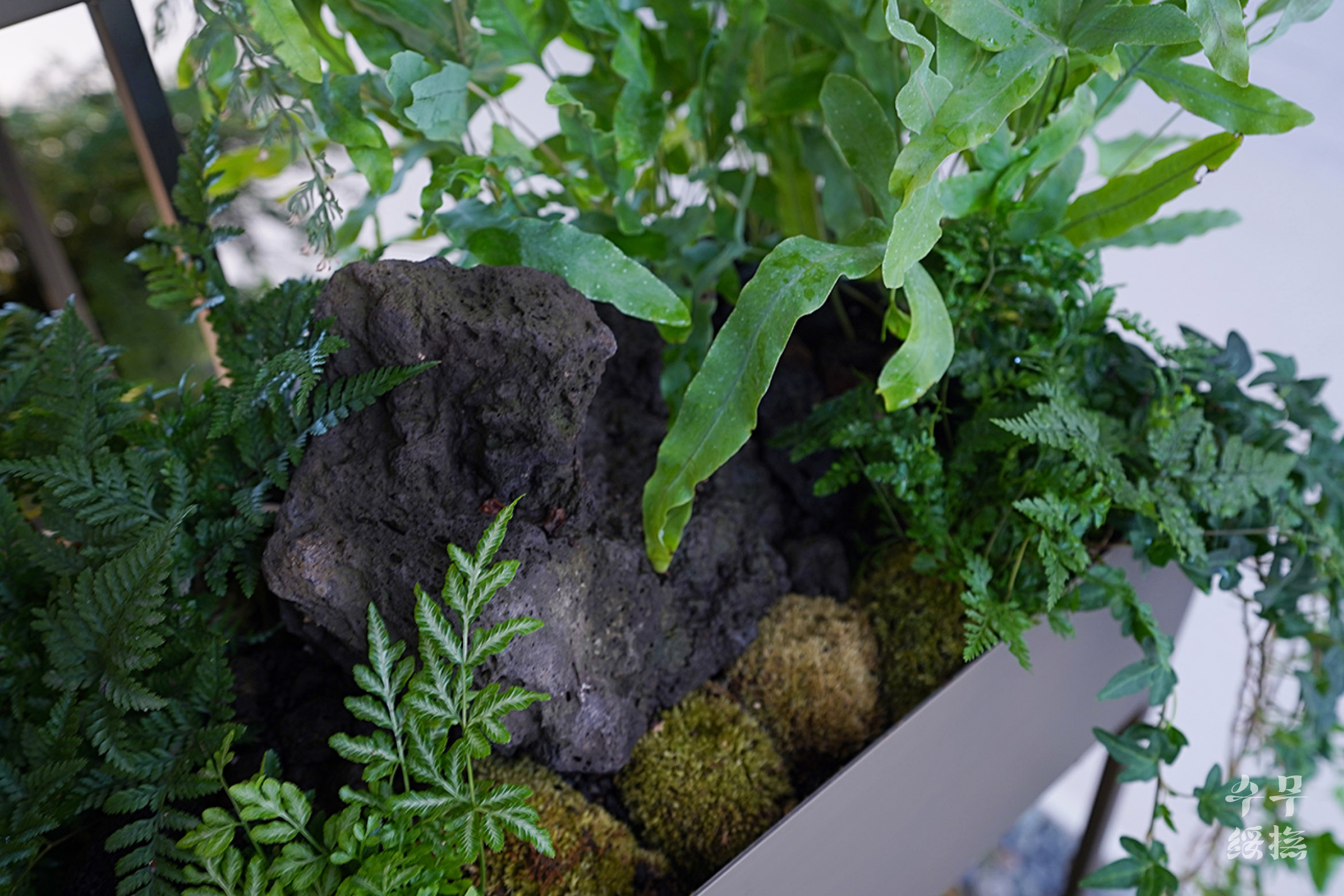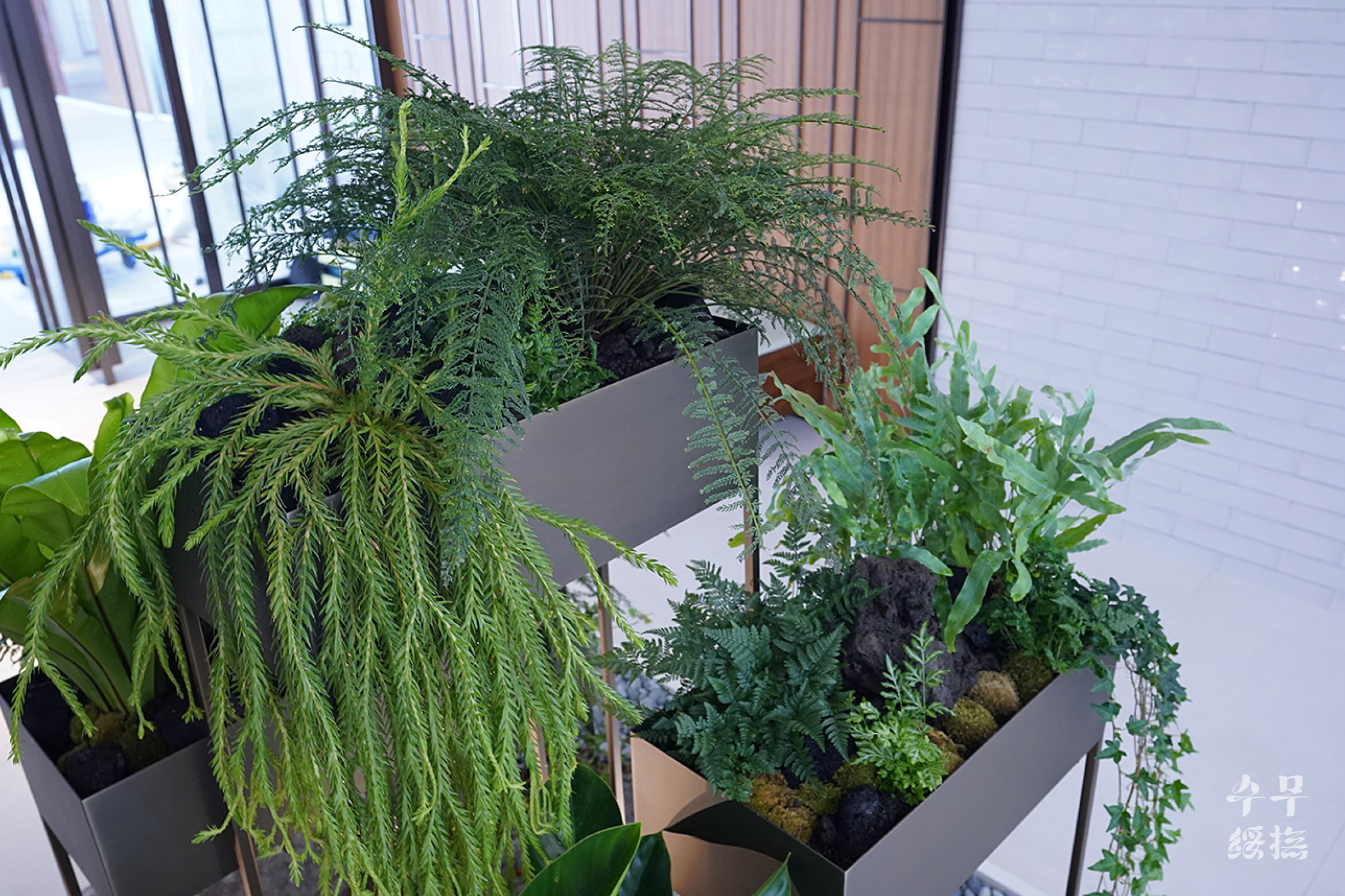 사진은 굉장히 밝은 공간처럼 나왔지만, 실제 현장은 굉장히 어두운 곳이었다. 게다가 스파라는 공간 특성상 굉장히 건조했다. 음지식물들이 대부분 습도를 좋아하는데, 건조한 부분이 가장 걱정이 됐다. 때문에 식물을 고를 때 가장 중요시 한 것이 건조한 환경에 적응할 수 있는가였다. 이 항목에 해당하는 식물 중에서 어우러지며 디자인 가능한 조합을 찾았다.