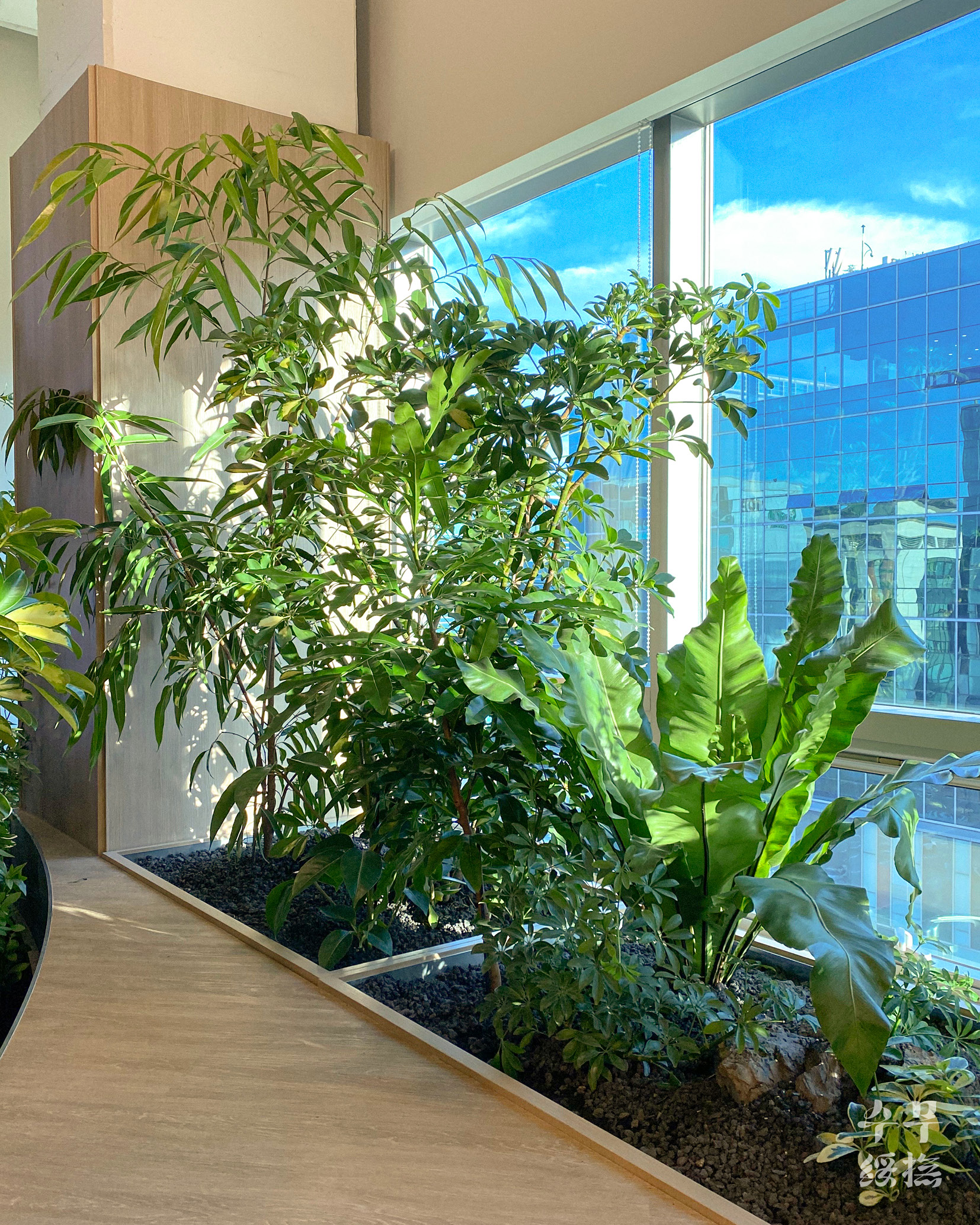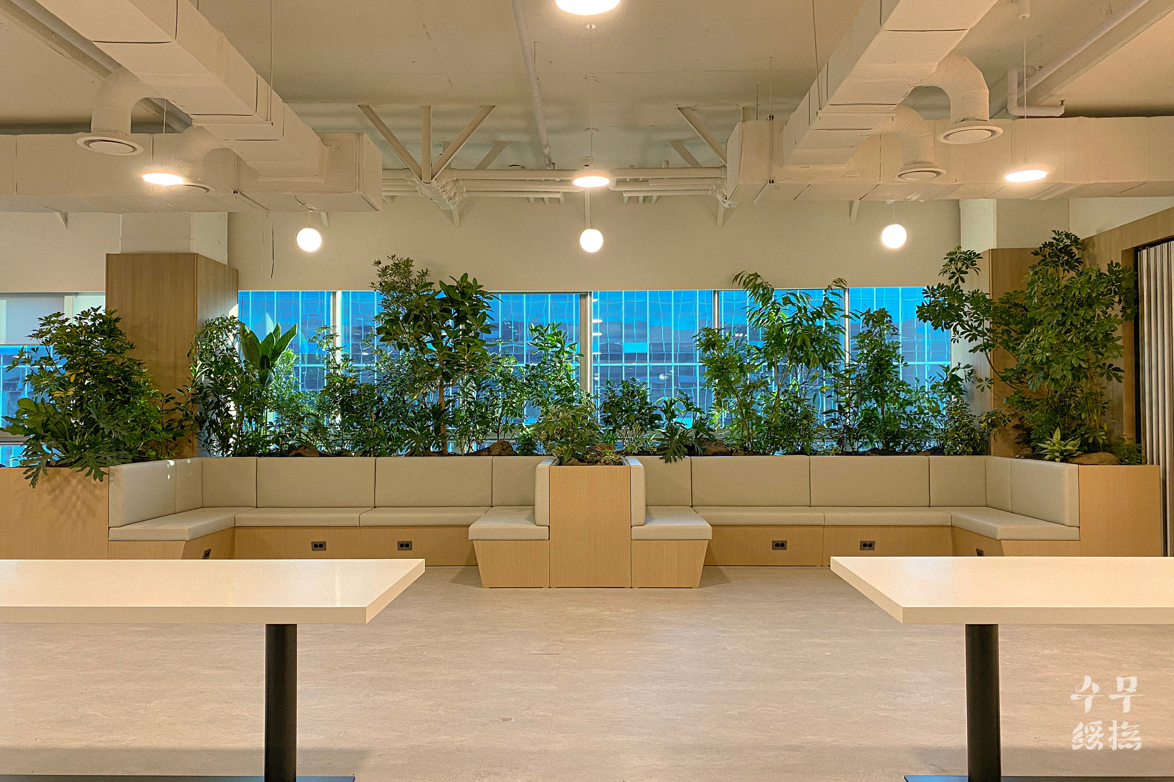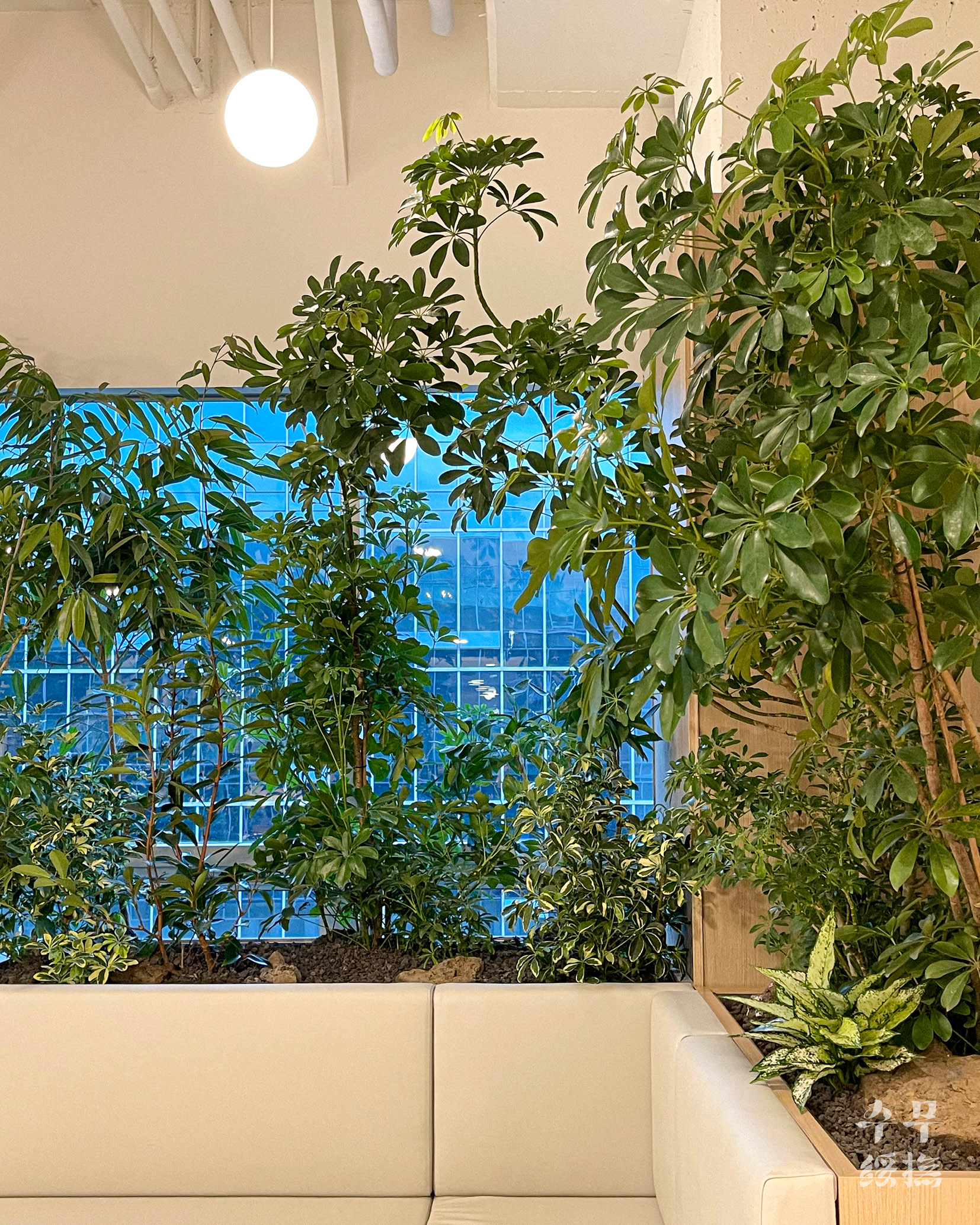 8층 휴게공간은 직원들이 휴식함과 동시에 함께 어울릴 수 있는 공간으로, 오피스와 공간 분위기를 연결시켜 차분하고 편안한 공간으로 만들고자 했습니다. 플랜트를 이용한 차폐를 통해 편안하게 휴식할 수 있도록 유도하였고, 내추럴 한 수종을 사용하여 실제 자연과 같은 분위기로 연출하였습니다.