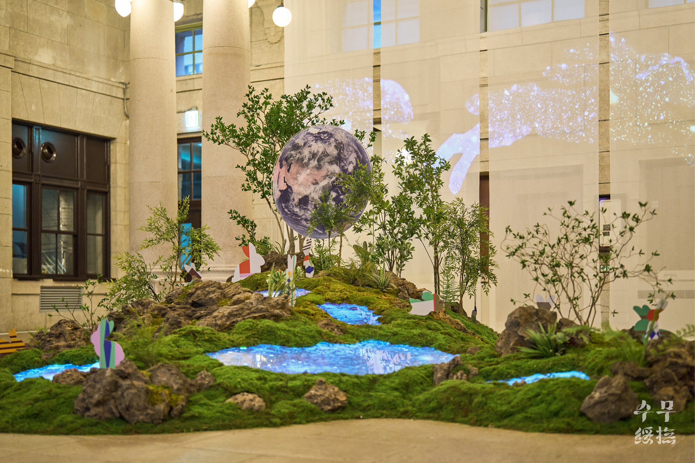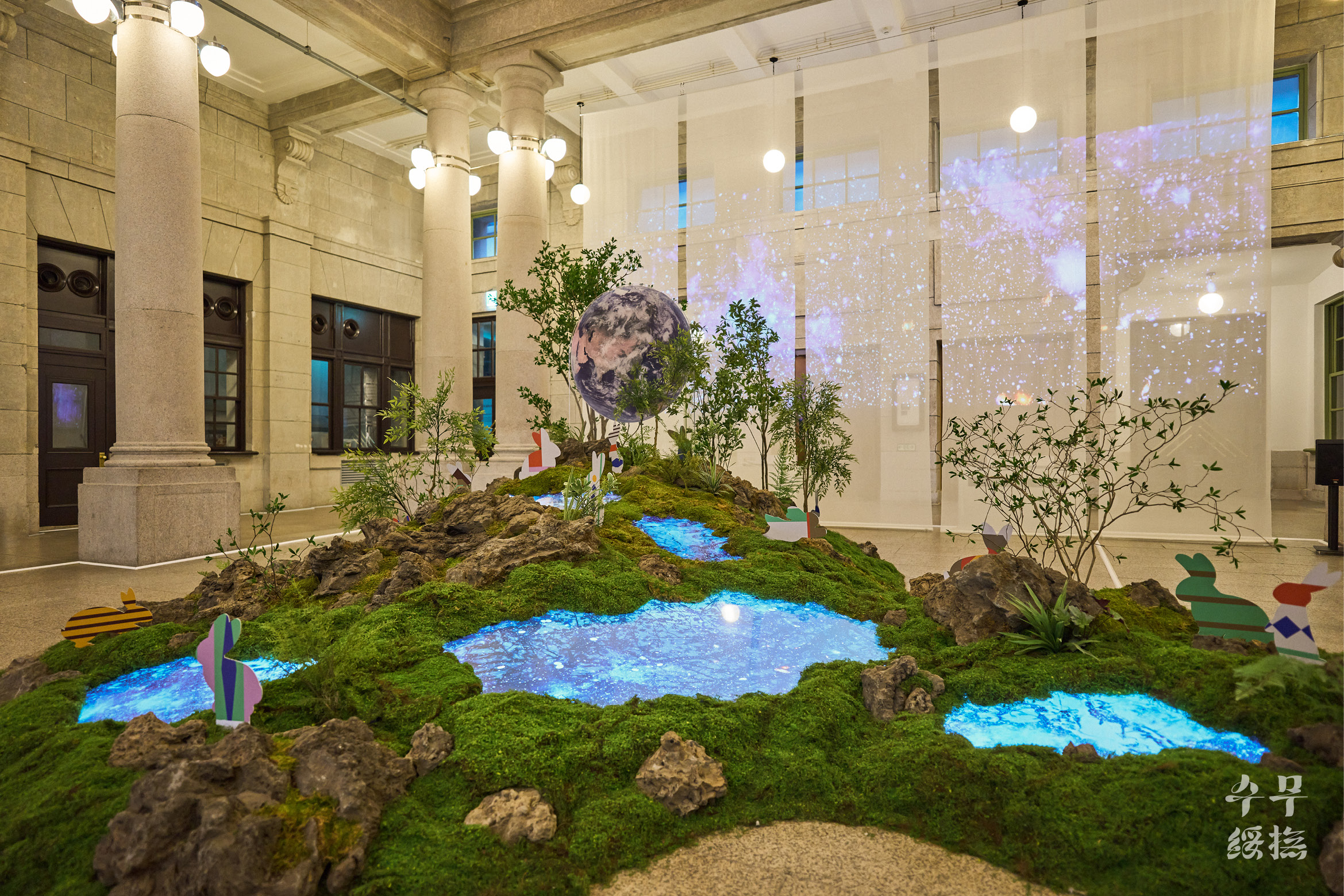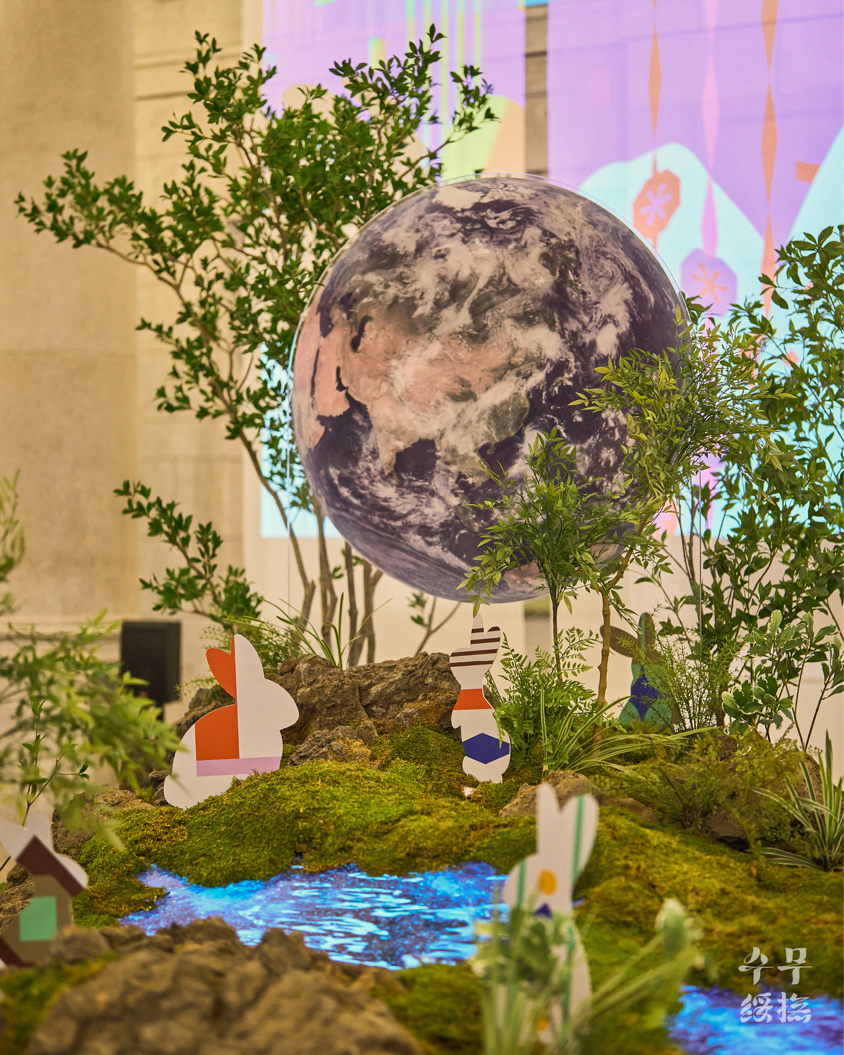 (지구에서 육안으로 관찰할 수 있는 달의 면적은 59%입니다. 즉 관찰할 수 없는 면적은 41%입니다.) 옛사람들은 달에 토끼가 살고 있다고 믿었습니다. 인류가 달에 착륙한 지 반세기가 지났지만 여전히 달을 올려다볼 때면 계수나무 아래 방아를 찧는 옥토끼를 먼저 떠올리곤 합니다. 이번 전시는 오랫동안 우리와 함께해 온’달’과 2023년을 상징하는 동물’토끼’로 시작을 알립니다. 달의 자전과 공전주기로 인해 지구인들은 평생 달의 앞면만 볼 수밖에 없다고 합니다. 여기에서 착안해 달의 뒷면에 녹음이 우거져있고 그곳 옹달샘에 물을 마시러 오는 토끼가 살고 있다는 작가의 즐거운 상상은 미디어 아트와 조경, 사운드, 조형물로 구현되었습니다.’이상한 나라의 앨리스’동화책에 나오는 흰토끼처럼 중앙홀의 옥토끼는 여러분에게 전시장 구석구석 전통문화로 떠나는 여정으로 손짓합니다. 이제 2023 뉴트로 페스티벌”오늘 전통” (Newtro Festival “TraditionNow” 2023)에서 오래오래 기억에 남을 전통문화의 가치를 탐색해 볼 차례입니다.
