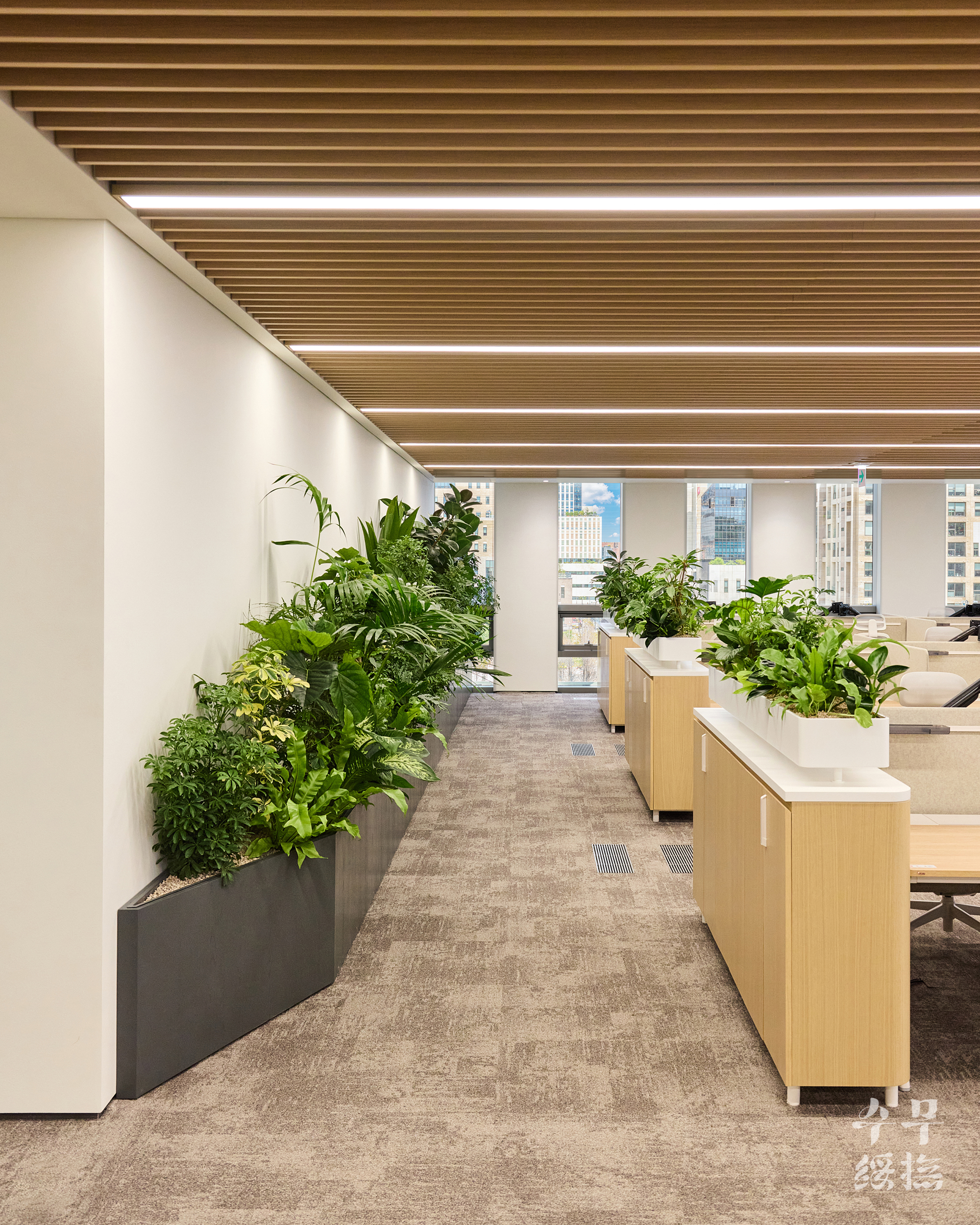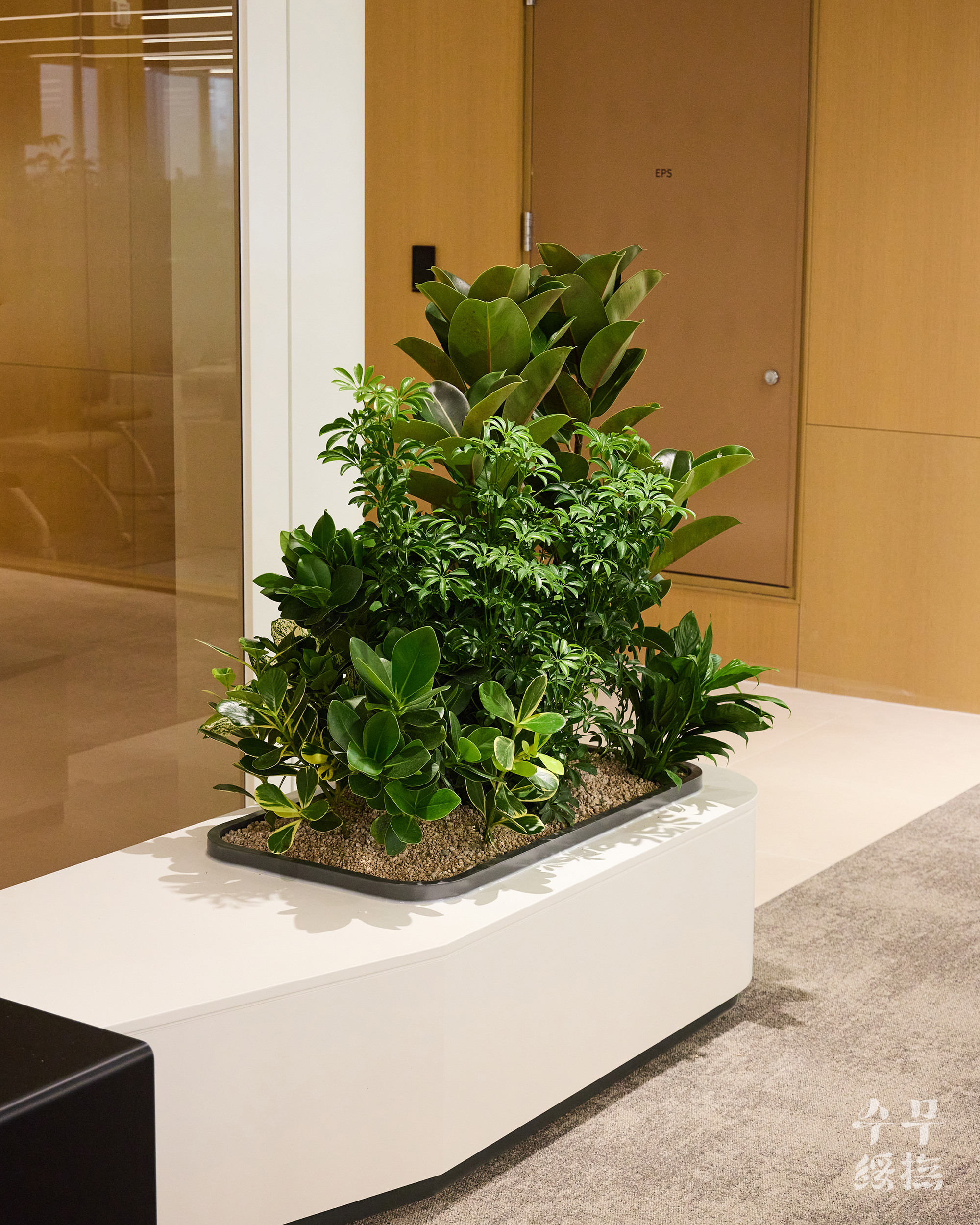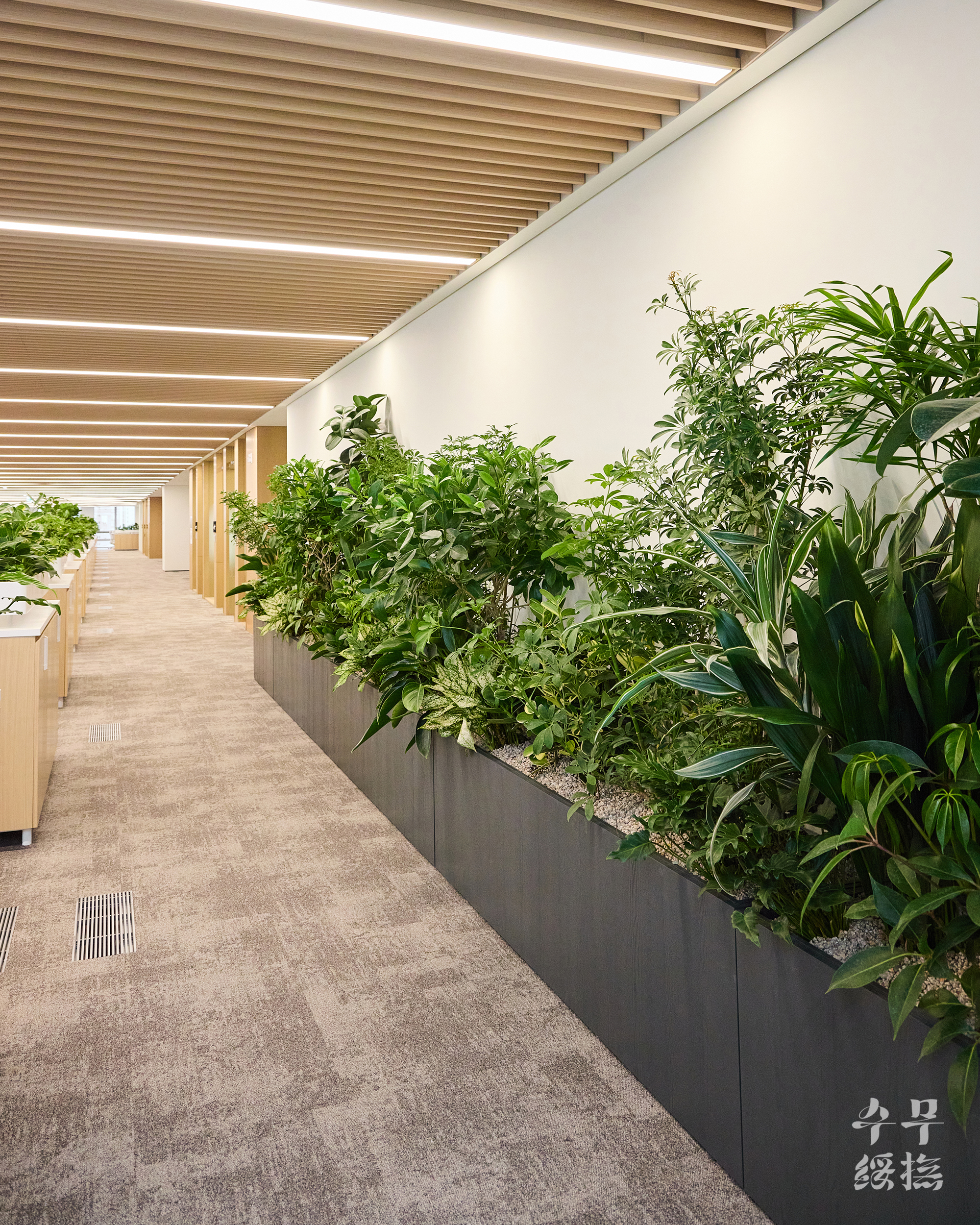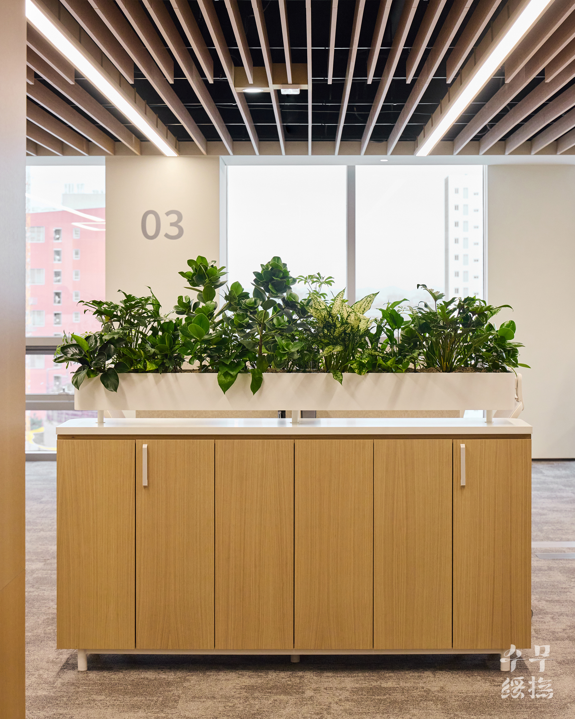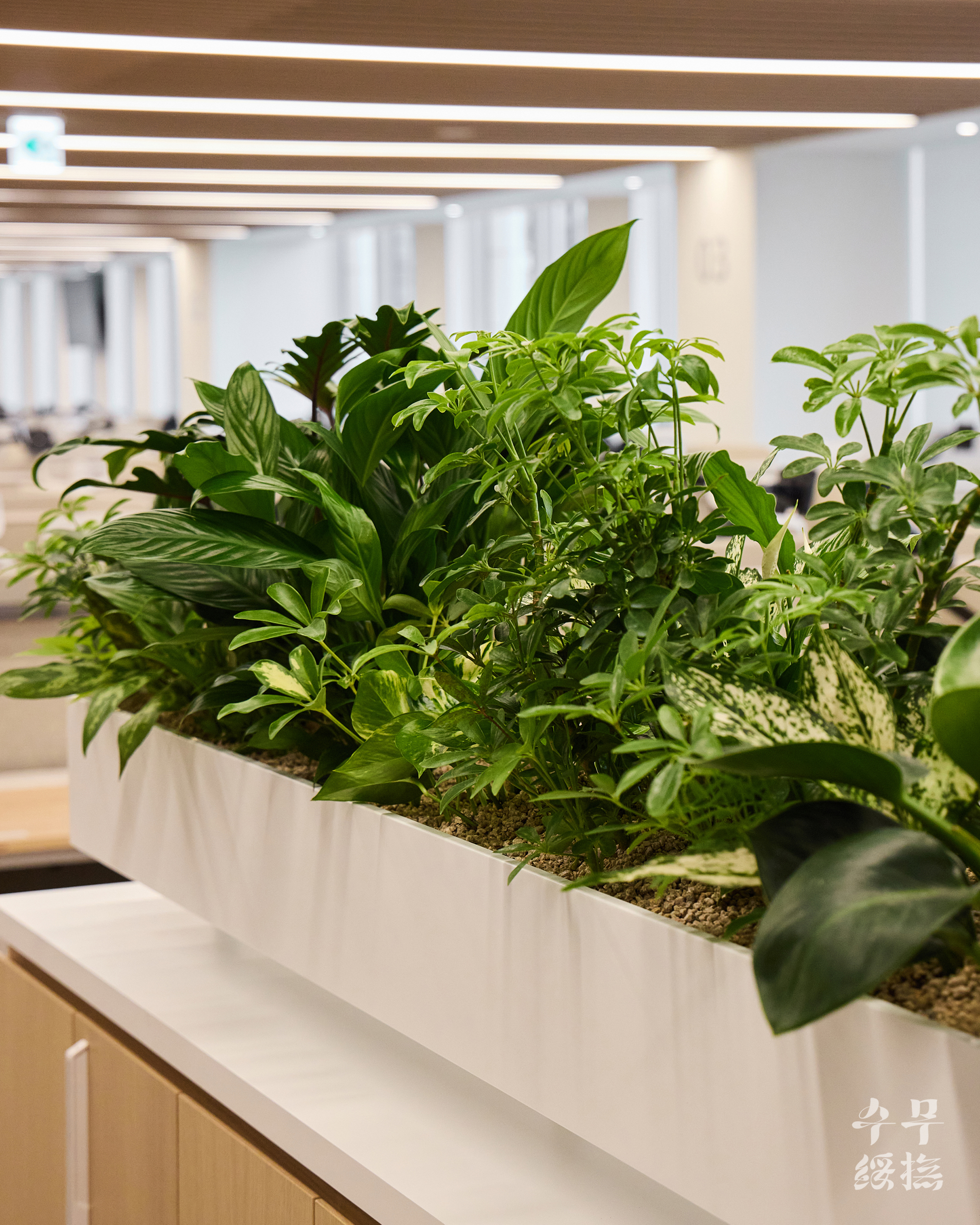 오피스 공간에 날것의 자연을 가져오면 되려 스트레스를 유발할 수 있습니다. 우리의 목표는 단순히 ‘초록의 풍경’을 만드는 것이 아니라 ‘정돈된 자연’이었고, 이를 위해 수무 오피스 내에서 식재 조합을 시뮬레이션하며 영속성을 고려하여 설계하고자 했습니다.