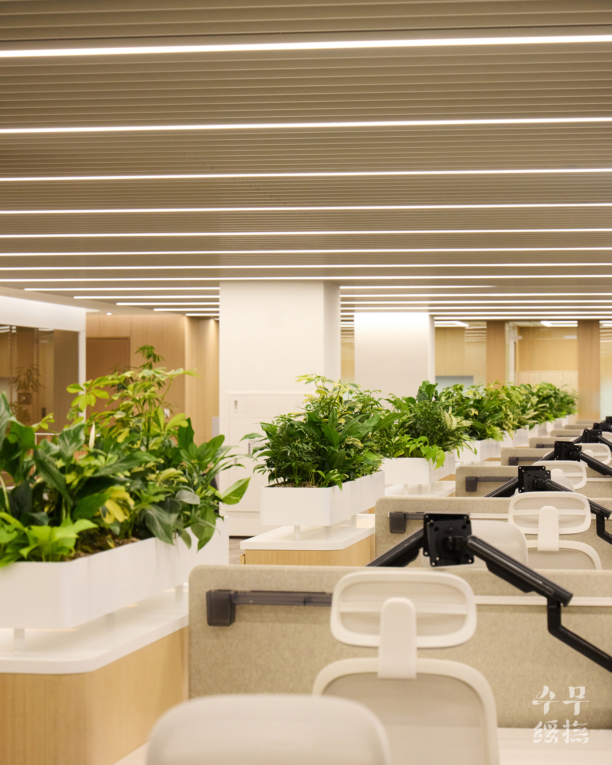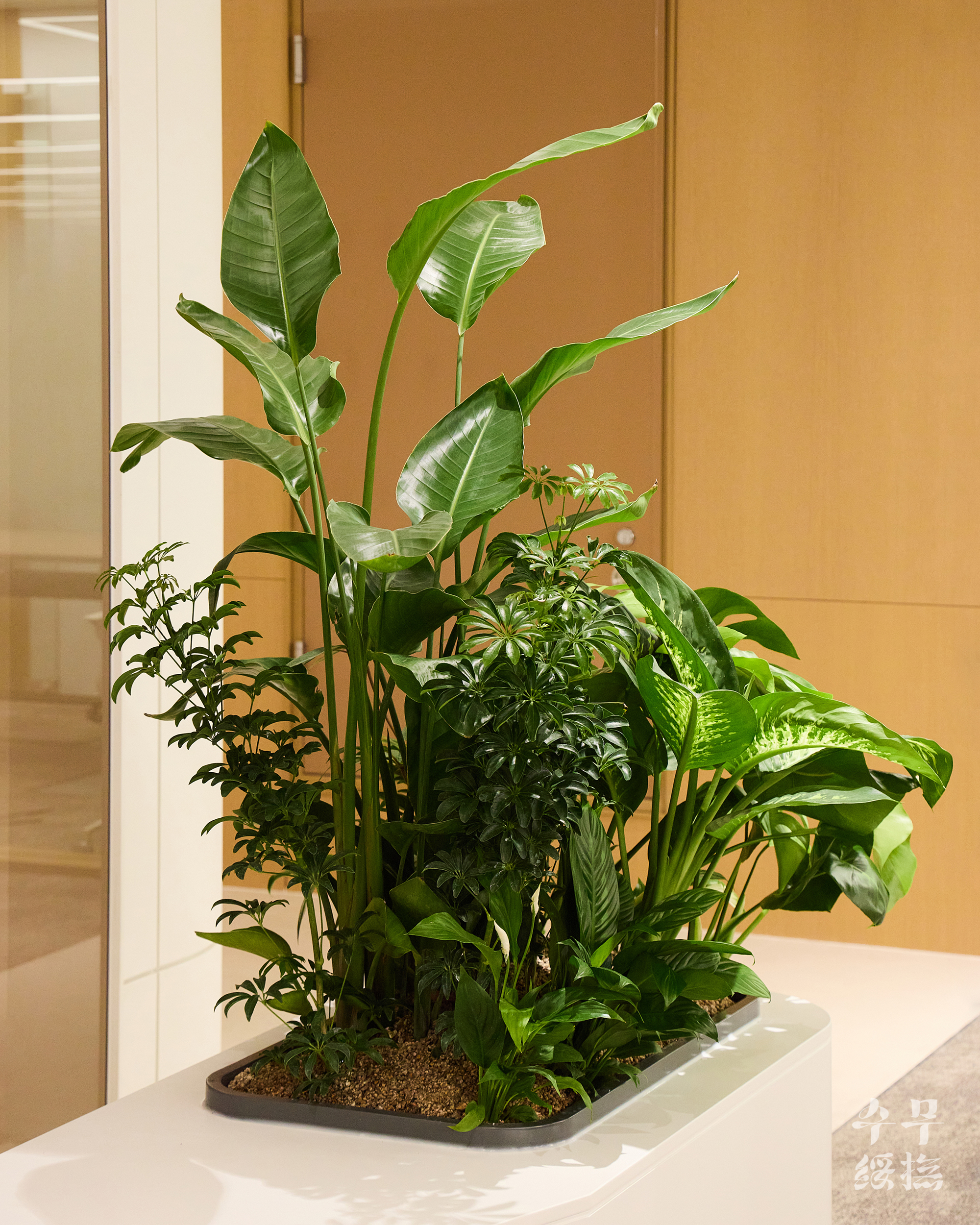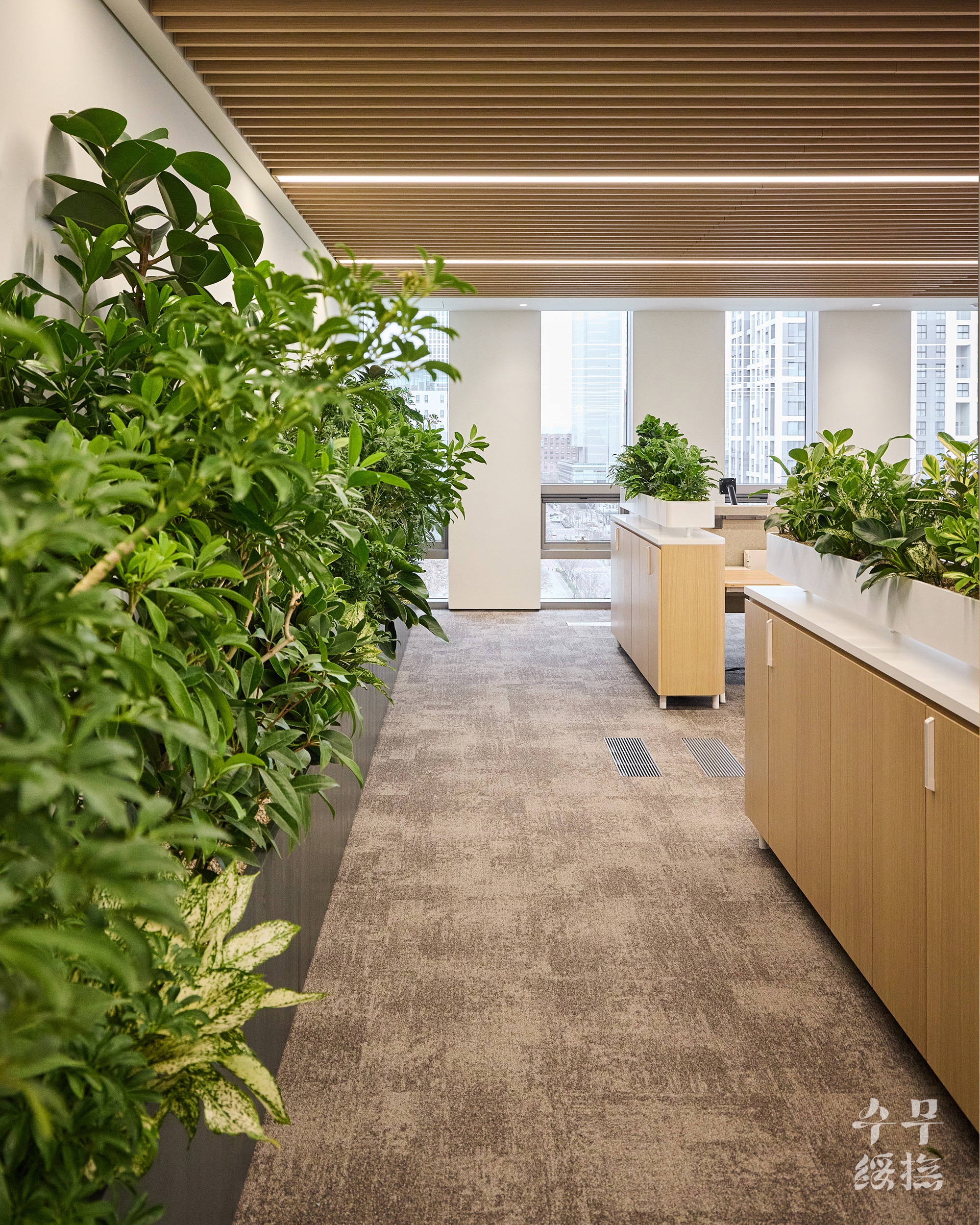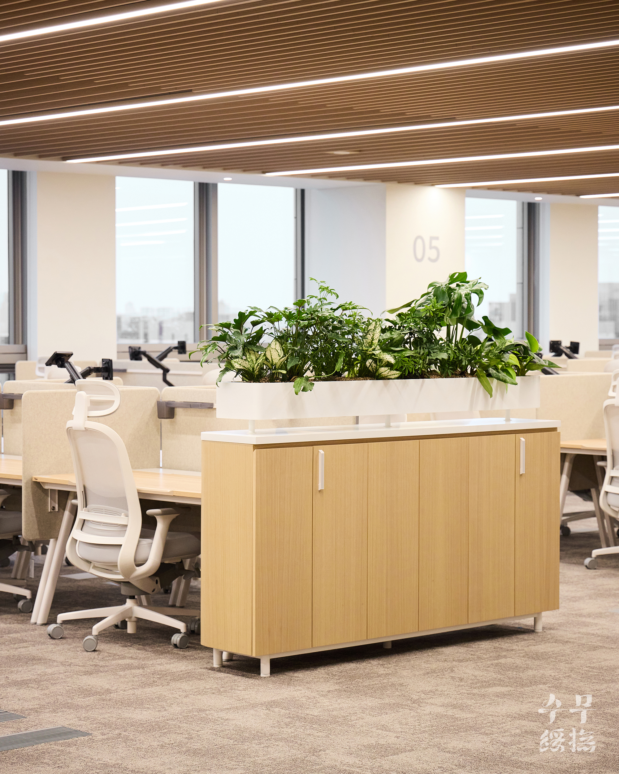 오피스 공간에 날것의 자연을 가져오면 되려 스트레스를 유발할 수 있습니다. 우리의 목표는 단순히 ‘초록의 풍경’을 만드는 것이 아니라 ‘정돈된 자연’이었고, 이를 위해 수무 오피스 내에서 식재 조합을 시뮬레이션하며 영속성을 고려하여 설계하고자 했습니다.