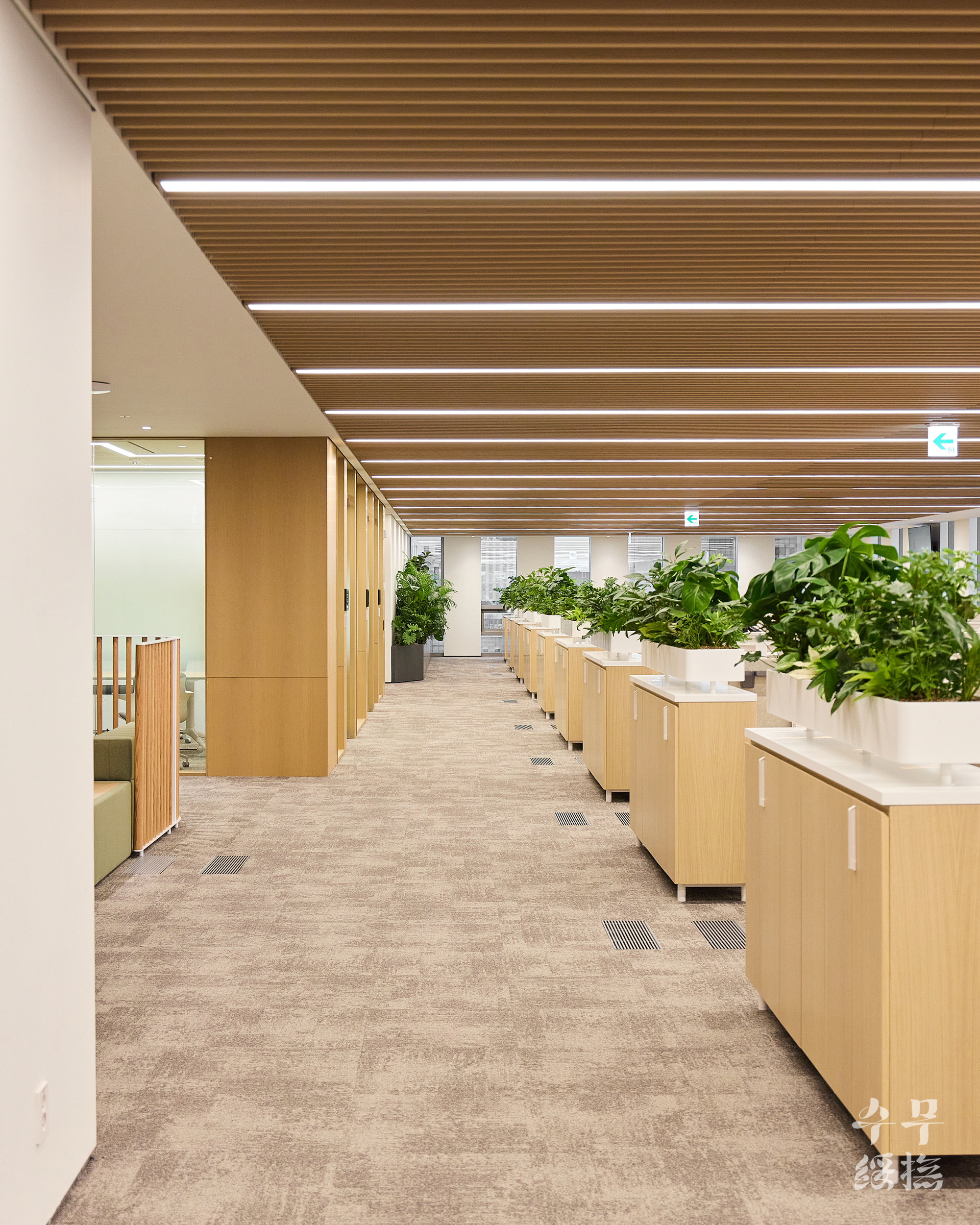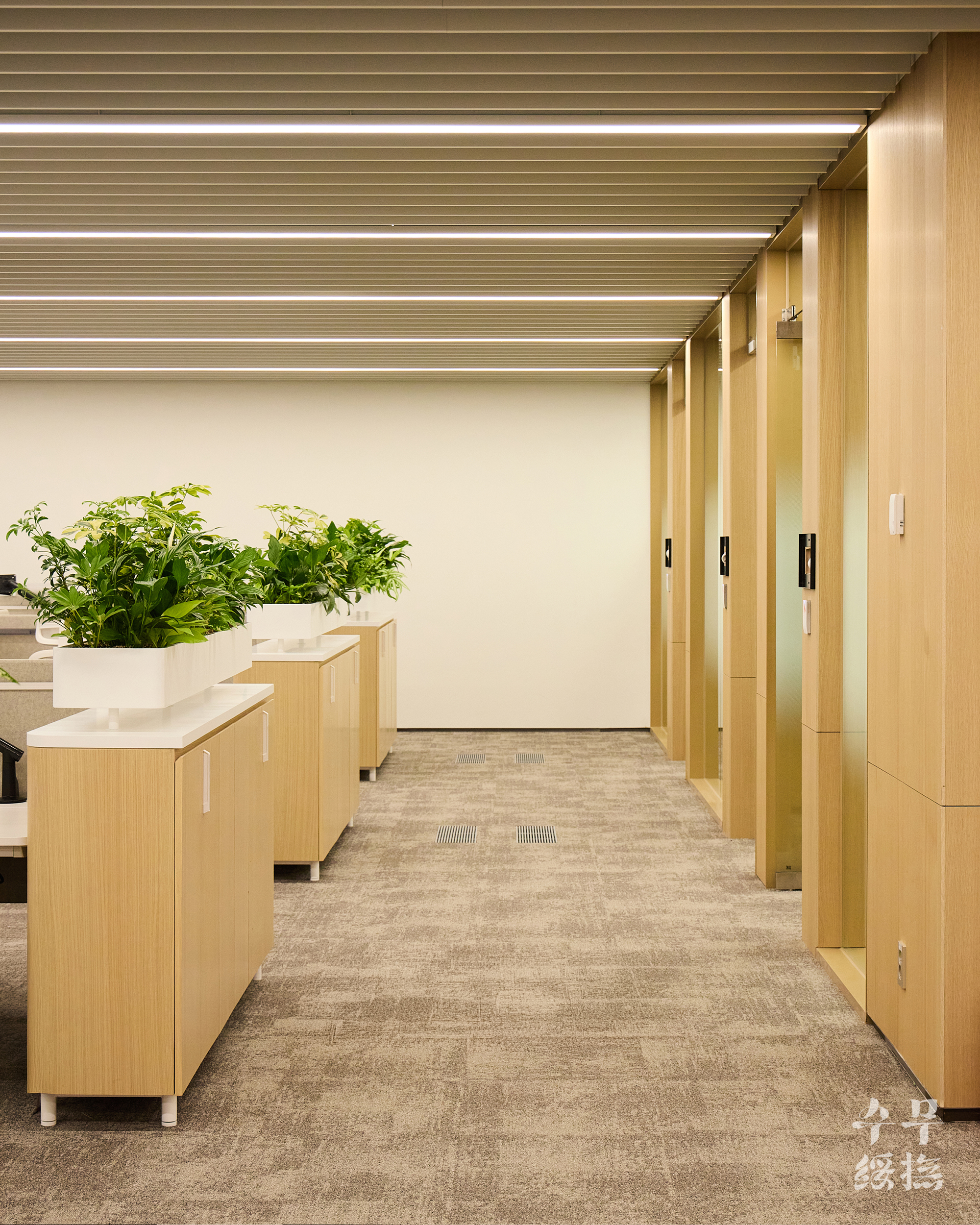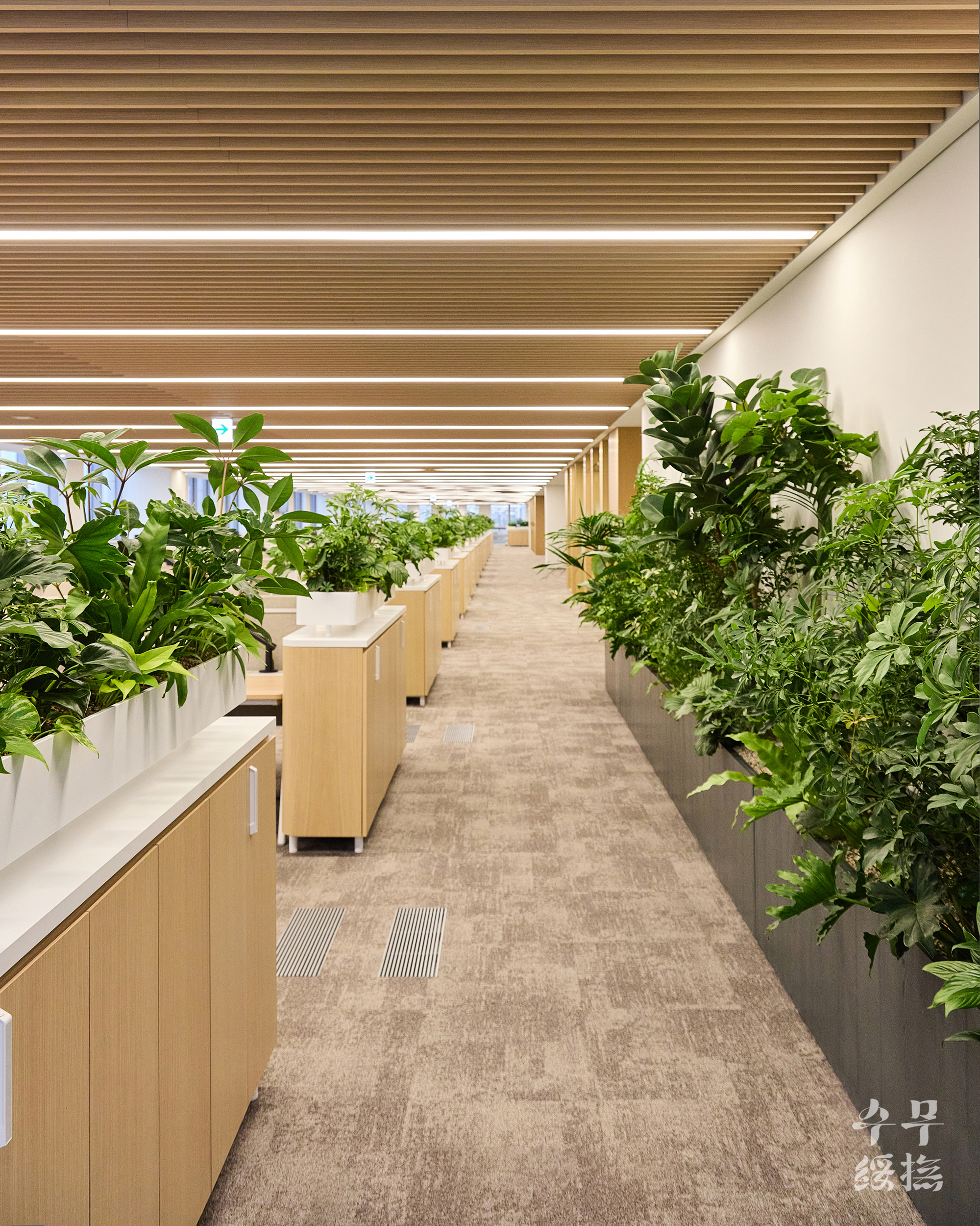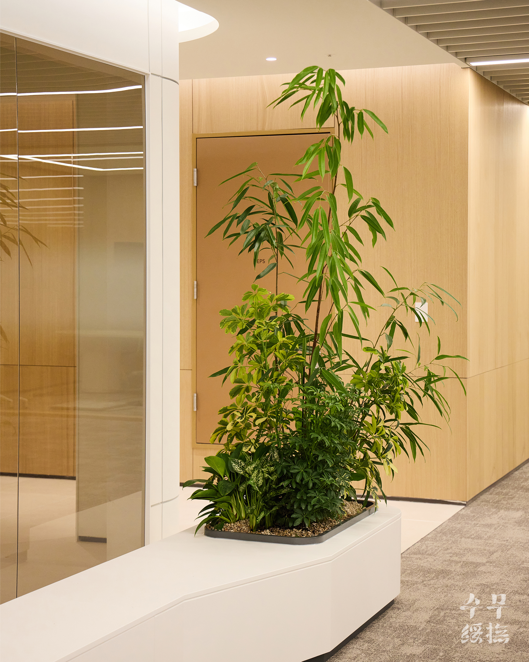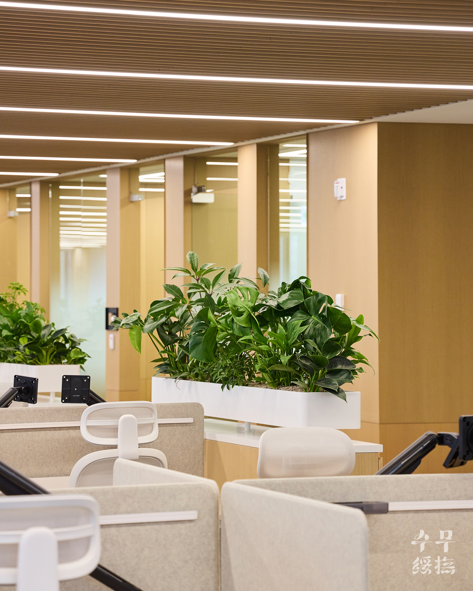 오피스 공간에 날것의 자연을 가져오면 되려 스트레스를 유발할 수 있습니다. 우리의 목표는 단순히 ‘초록의 풍경’을 만드는 것이 아니라 ‘정돈된 자연’이었고, 이를 위해 수무 오피스 내에서 식재 조합을 시뮬레이션하며 영속성을 고려하여 설계하고자 했습니다.